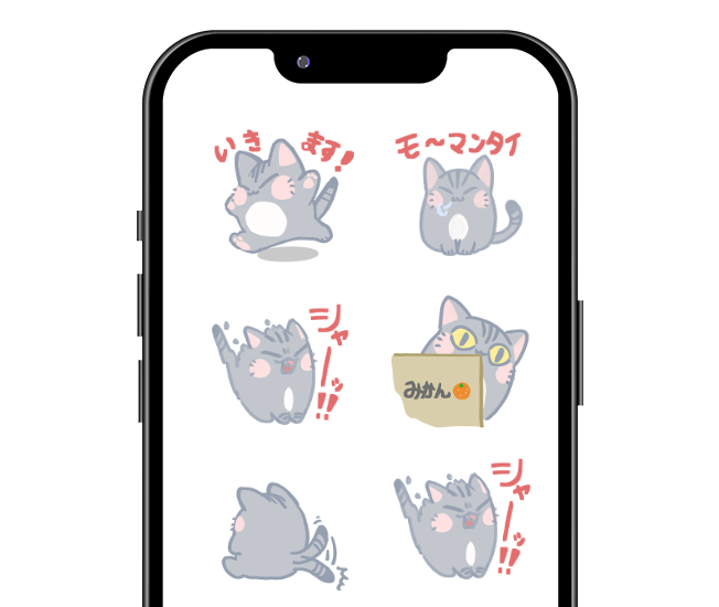 自主制作したLINEスタンプです。実家で飼っていたアメリカンショートヘアのオス猫がモチーフです。 柔らかい雰囲気にしたかったため、主線にグレーを使いました。 -