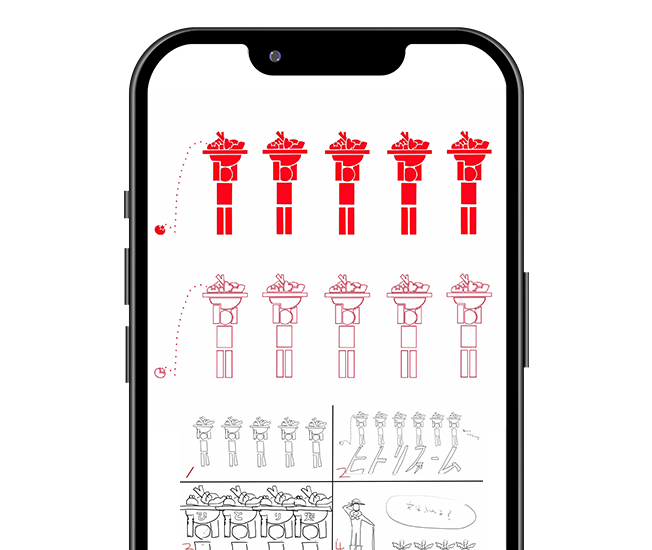個人の方の依頼で、貸し農園の看板デザインロゴを担当しました。ロゴのデザインは、5人の人物が野菜の入ったかごを持っている様子を表しています。落ちているものはトマトです。このロゴは家庭菜園の活動やコミュニティを象徴しています。 -